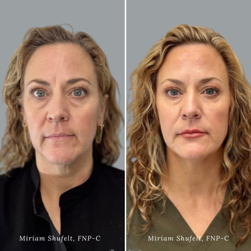 You may notice some early fullness from the injection fluid, but true Sculptra® results develop gradually as your collagen builds, typically becoming visible within 4 to 12 weeks after treatment. A series of treatments is usually recommended, and once your full correction is reached, the improvements can last about 2 years or longer before maintenance is necessary.