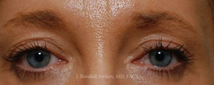 Before- This patient was unhappy with her upper eyelid skin folds and the lower eyelid bags.